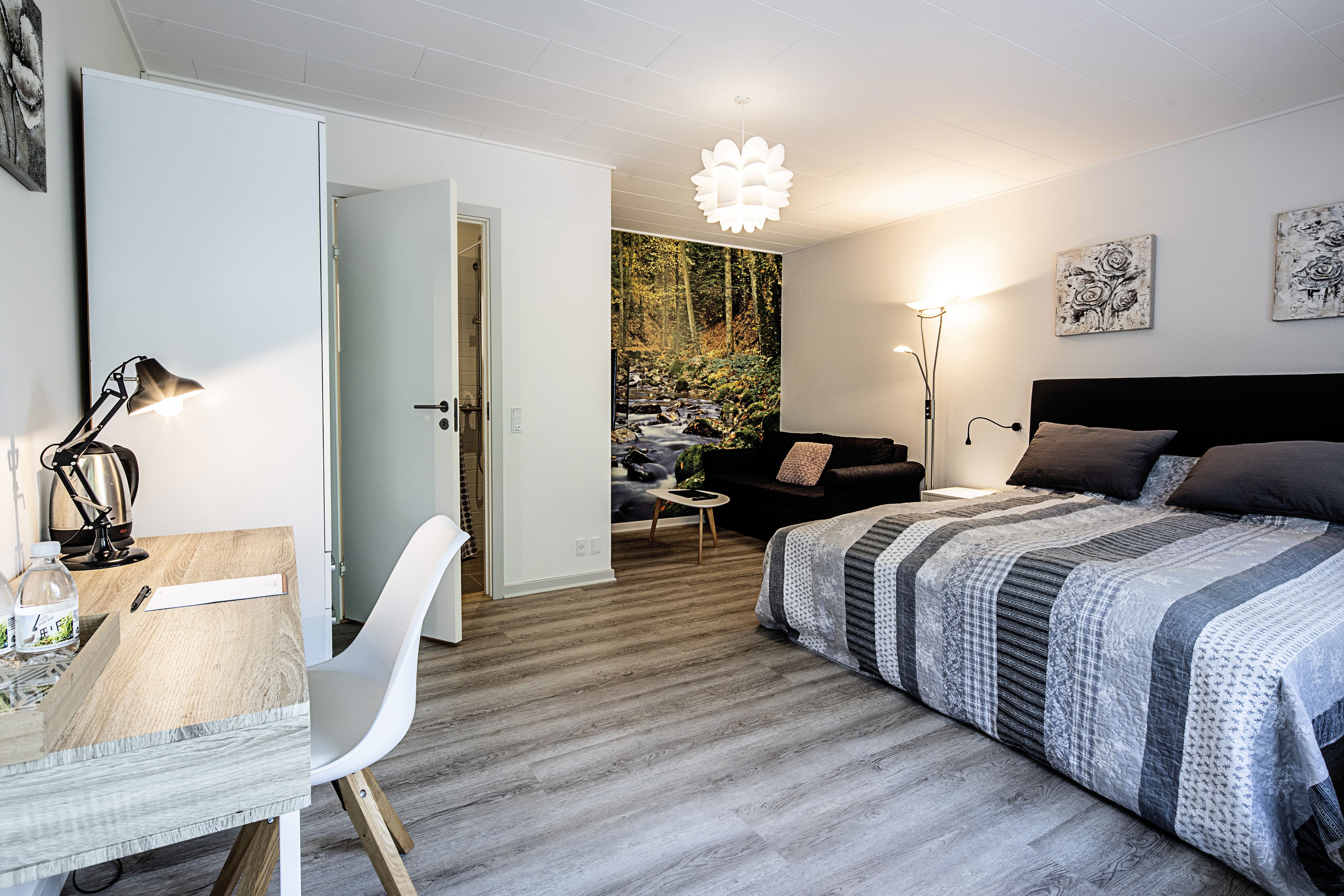 I overnatter i rolige omgivelser i store, nyrenoverede og komfortable værelser i senge af høj kvalitet. Værelserne er udstyret med sofa, tv og bad/toilet.
