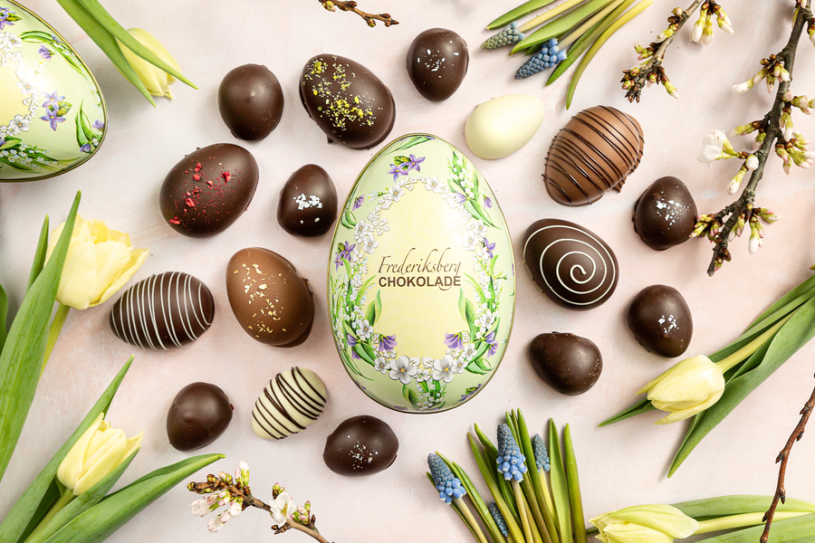 Fejr højtiden og forkæl dine nærmeste med luksuriøse påskeæg fra den ikoniske specialbutik, Frederiksberg Chokolade. Du kan vælge et fabergéæg i tre forskellige størrelser, som er proppet med udvalgte store og små chokolade- og marcipanæg i forskellige varianter som f.eks. pistacie, kokos, mandel, orange, citron eller kaffe.