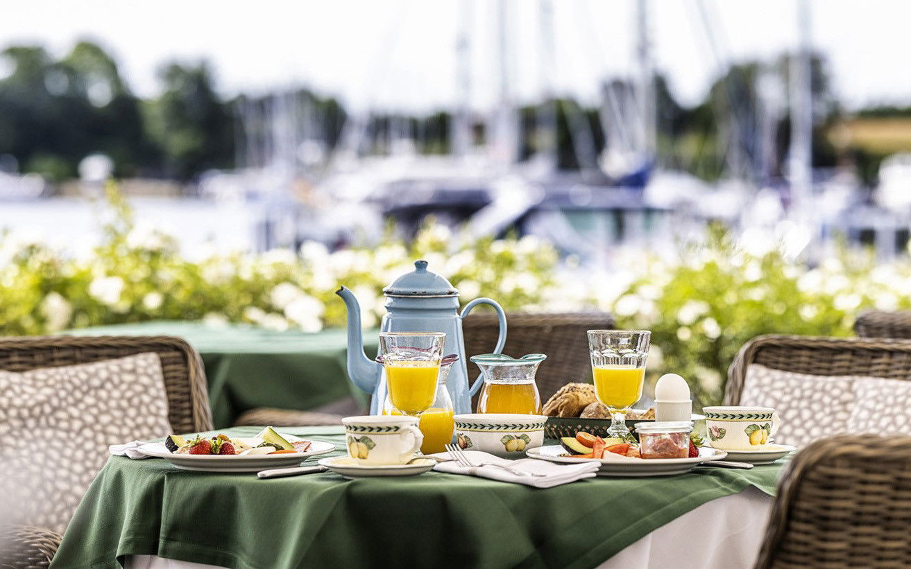 Efter en god nats søvn kan I glæde jer til at stå op til flere gastronomiske forkælelser i selskab med Dyvig Badehotels overdådige morgenmad De Lux, hvor de lokale specialiteter er fremtrædende. Til morgenmaden serveres Arabicakaffe eller te fra Perchs Tehandel i København og et glas 'Blanc de Blanc' mousserende vin. Morgenbordet er et overflødighedshorn, der bl.a. byder på hjemmebagte rundstykker, friskpresset appelsinjuice og lokal æblemost fra Hestehavegaard samt speltbrød og rugbrød fra Dyvigs konditori, Slagter Nielsens spegepølser og rullepølse, Dyvigs hjemmerøgede havlaks og gravede havlaks med sennepscreme, osteudvalg, økologiske blødkogte æg, frisk frugt og yoghurt.