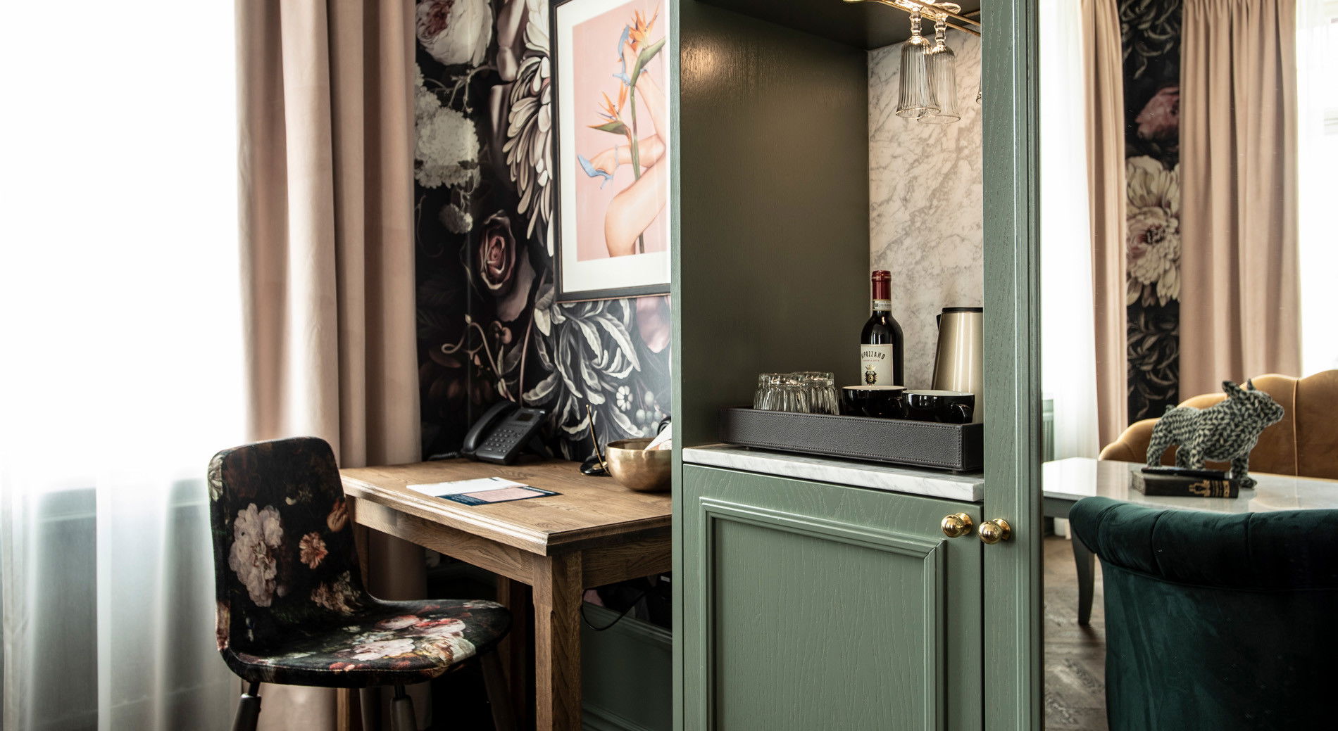 Når I overnatter på det gamle bankpalads, bliver det på et flot indrettet dobbeltværelse, hvor historien møder det nye med smukke paneler, blomster, guld, fløjl og moderne kunst. Alle værelser byder derudover på en minibar med et nøje udvalgt sortimentet samt et flot badeværelse med hotellets eget hudplejesortiment.