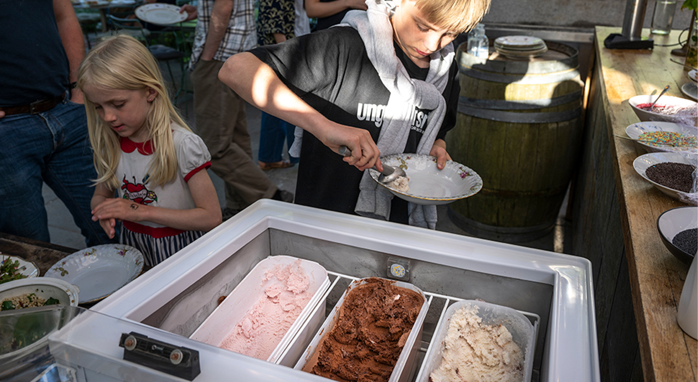 Dertil serveres et stort udvalg af lækre salater, som kokken kreerer, og efter de varme og kolde retter kan du og dit selskab tage for jer af den iskolde isbuffet med toppings. Derfor tør vi roligt garantere, at du ikke går sulten fra en pizzaaften hos Ørangeriet.