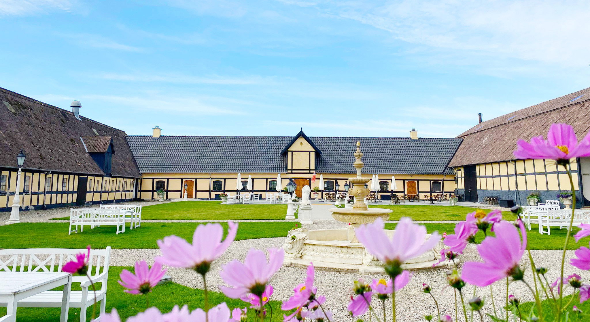 Et ophold på godset er som at skrue tiden flere hundrede år tilbage, men stadig få den fulde luksusoplevelse. Her kan I nyde et glas hvidvin under det over 350 år gamle kastanjetræ i haven, opleve total stilhed på en bænk ved voldgraven og drikke kaffe i den smukke atriumgård.