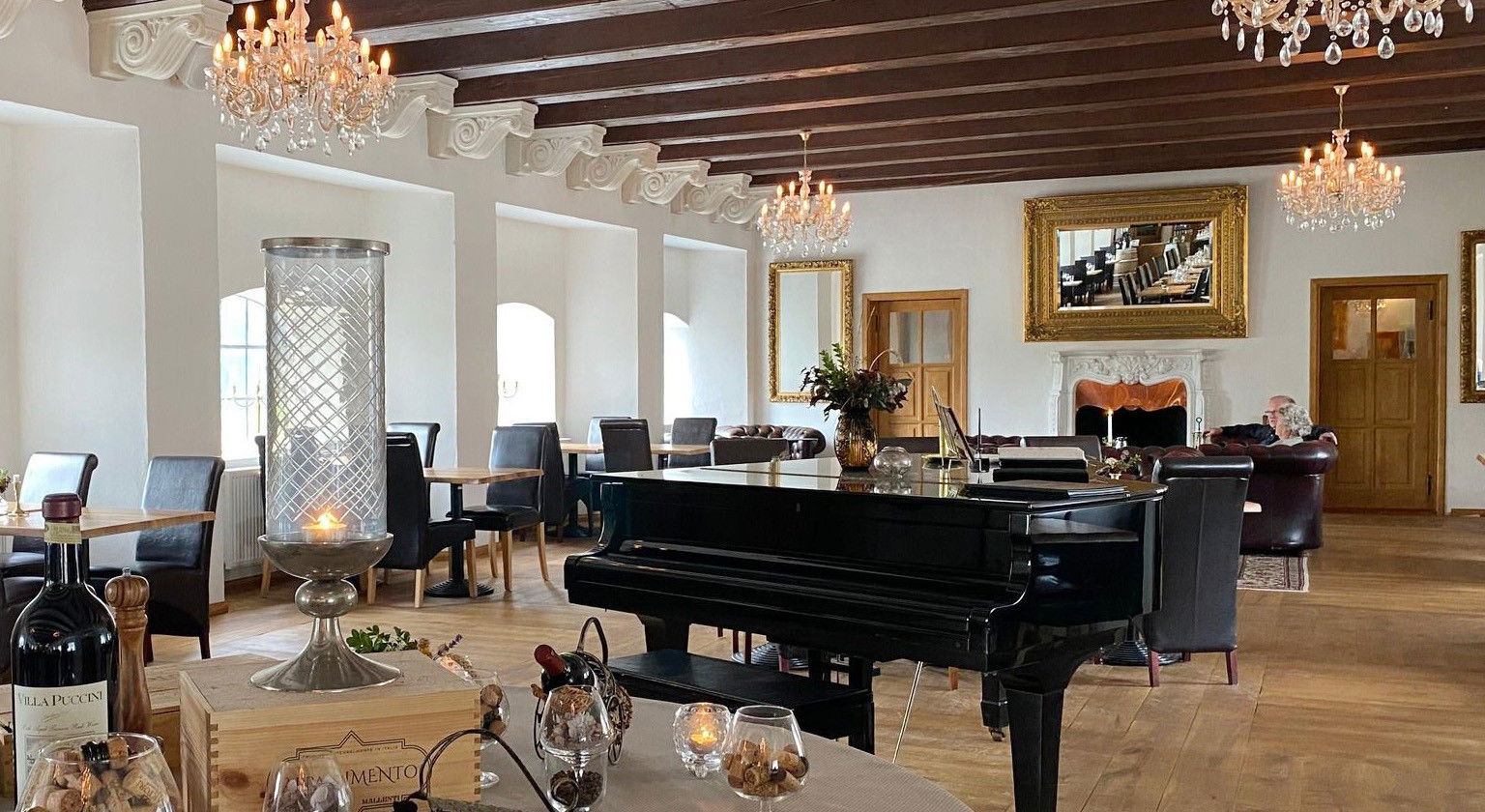 I godsets rustikke kælder findes en hyggelig, stemningsfyldt vinkælder med pejsestue. Her kan I begynde aftenen med et lille glas i de rette rammer. Og i godsets imponerende riddersal, som også fungerer som godsets restaurant, får I en aften, I sent vil glemme. Her er åben pejs i begge ender, brede egetræsplankegulve, stuklofter og antikke krystallysekroner.