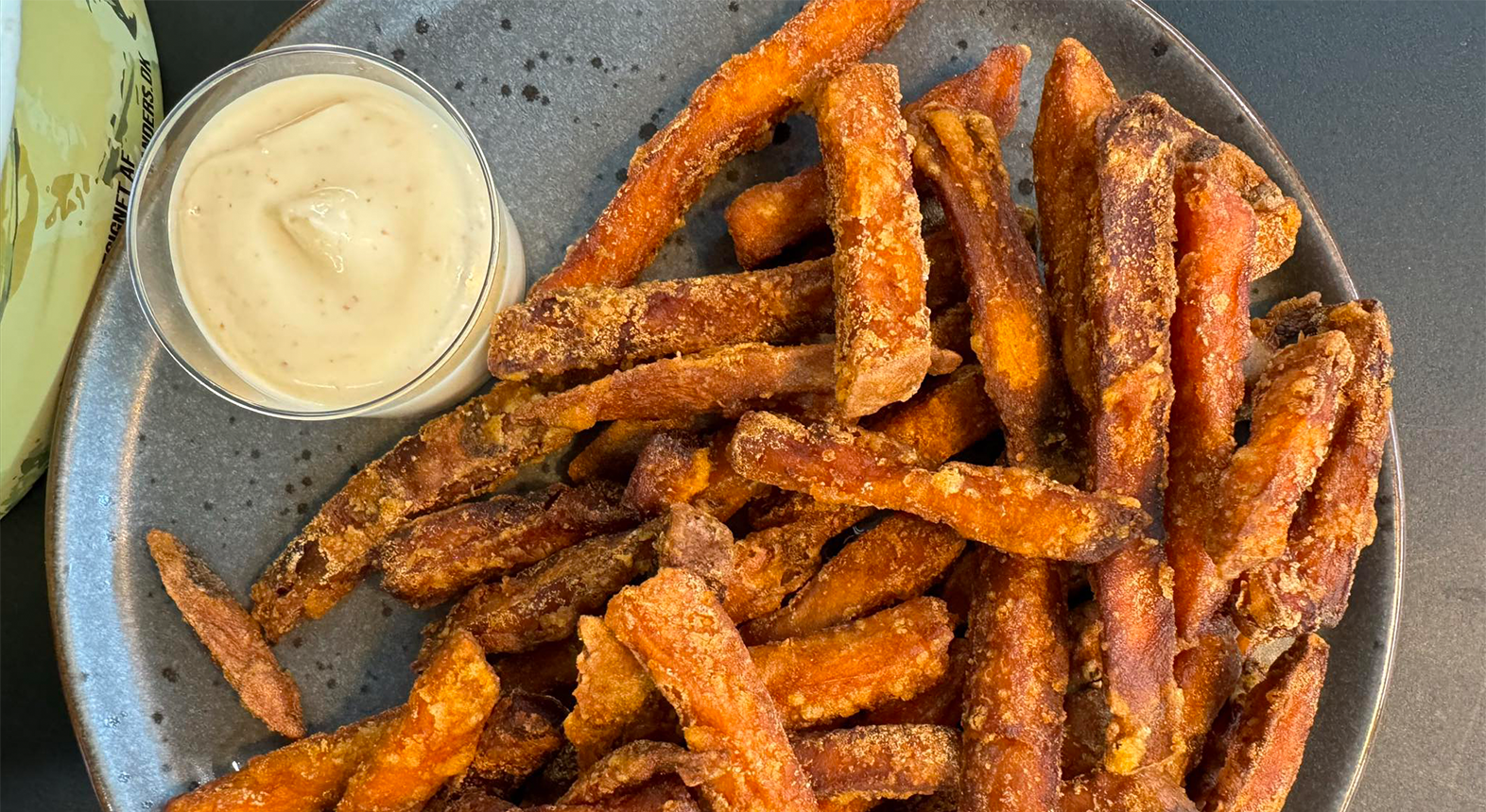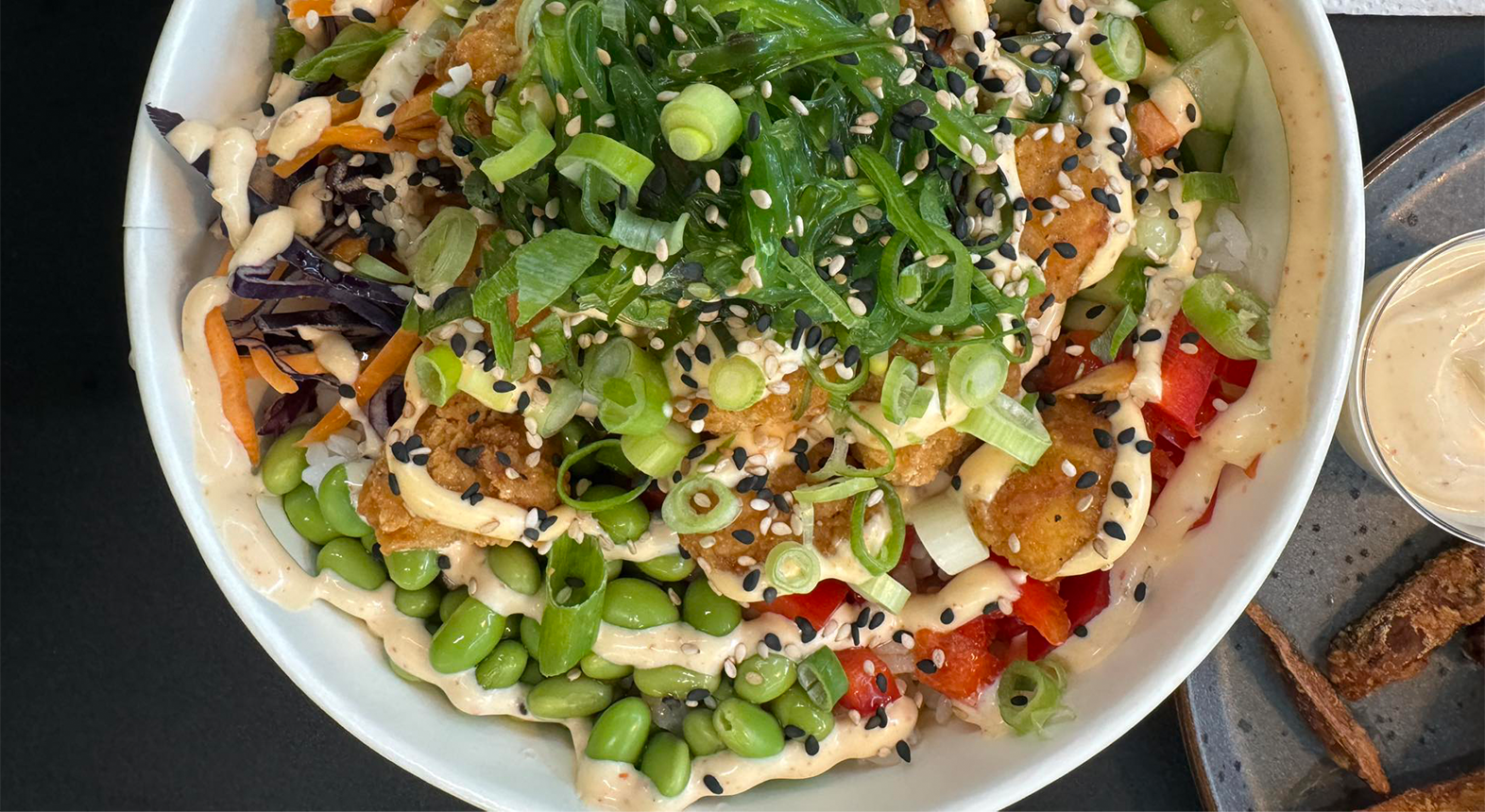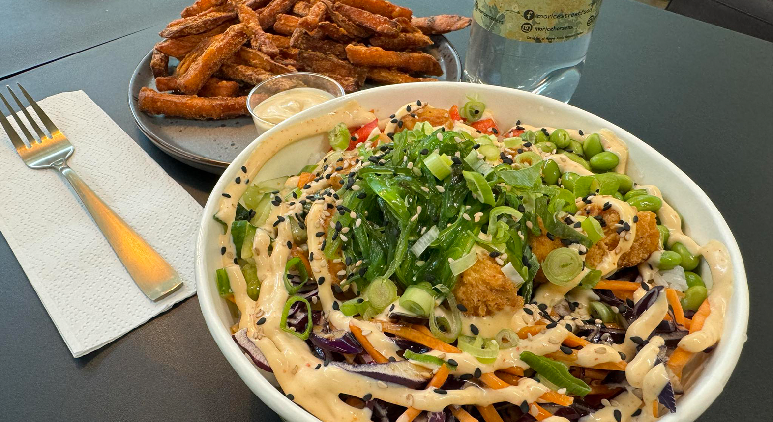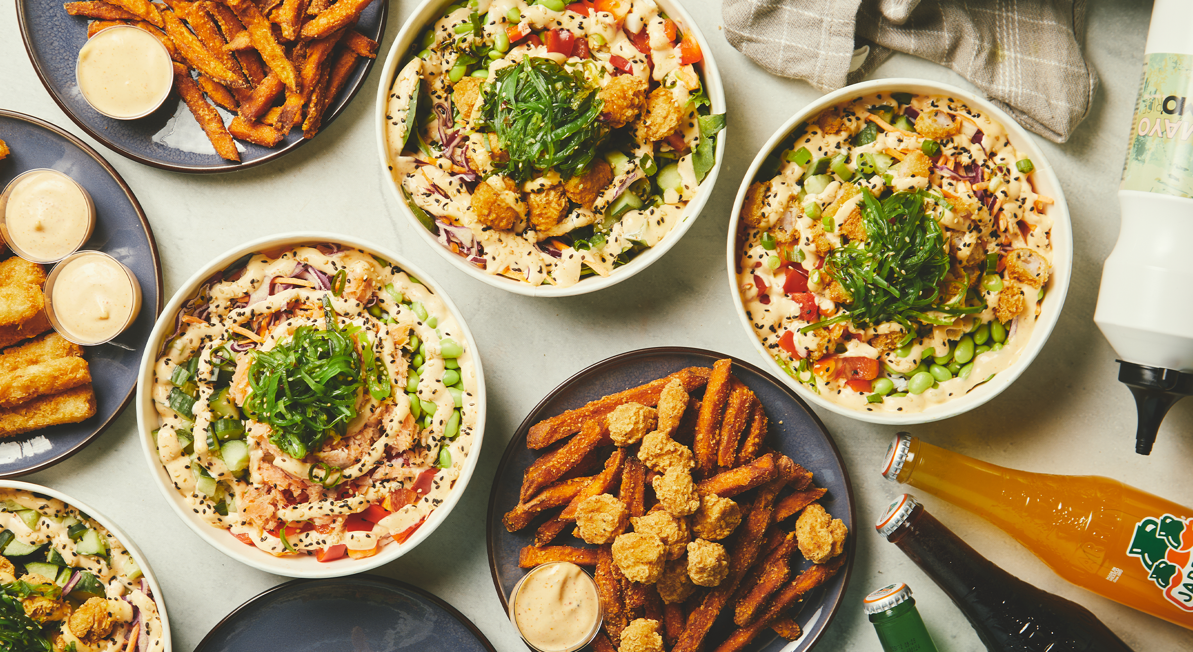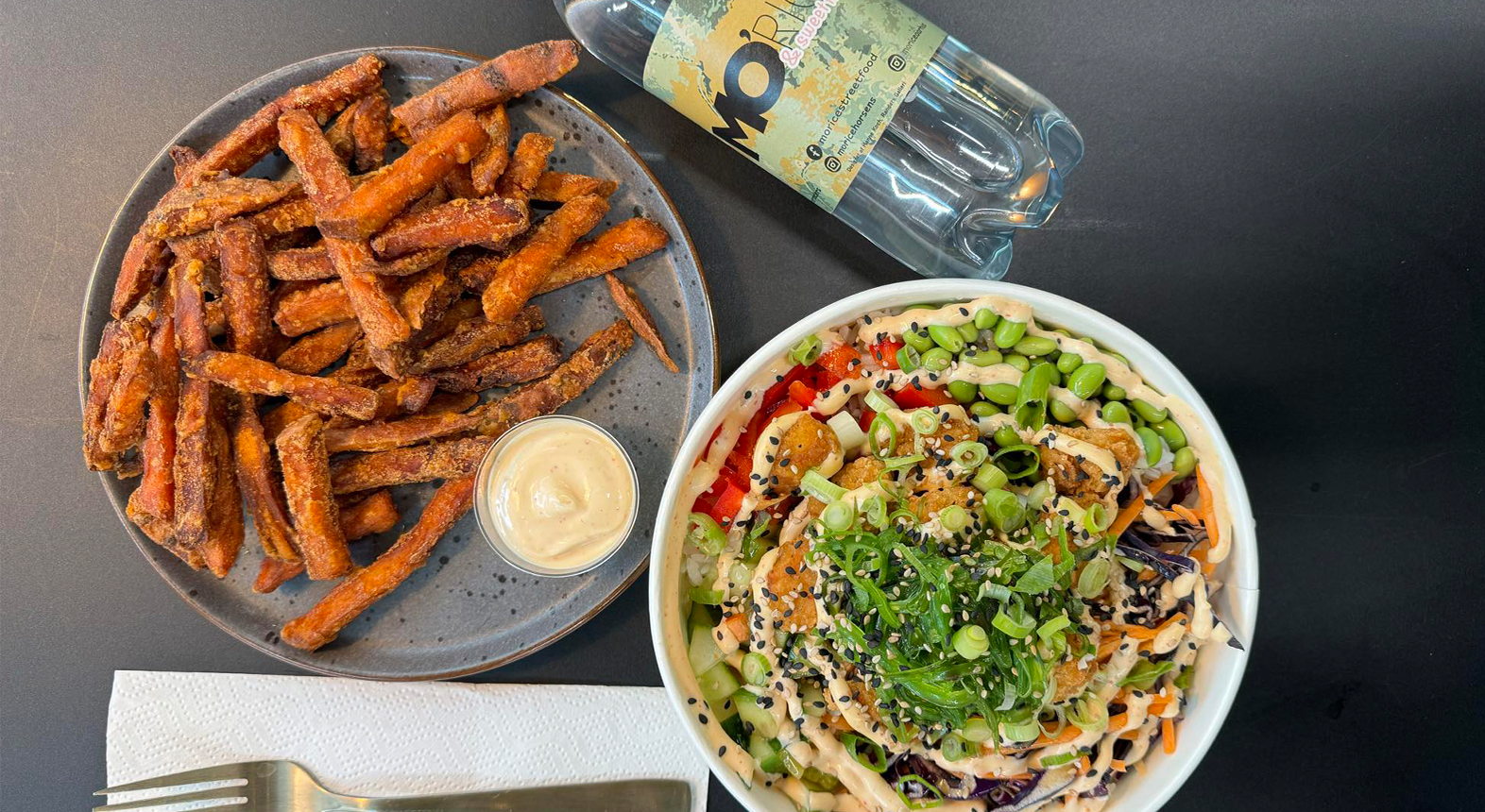 Som kronen på madværket serveres poke bowlen med sprøde sweet fries lavet på sød kartoffel og med den krydrede chilimayo til. Sluk tørsten med en kildevand eller en sukkerfri Jollycola.