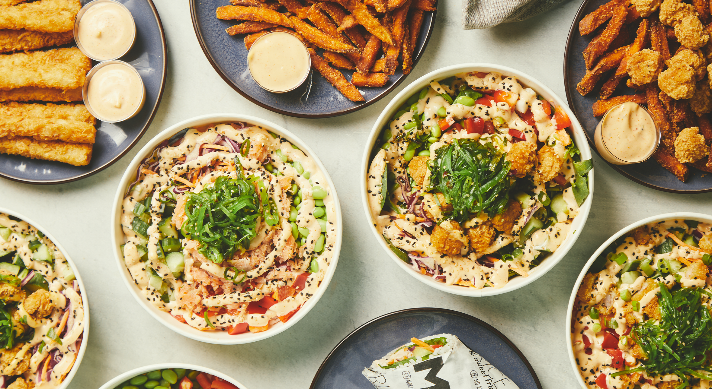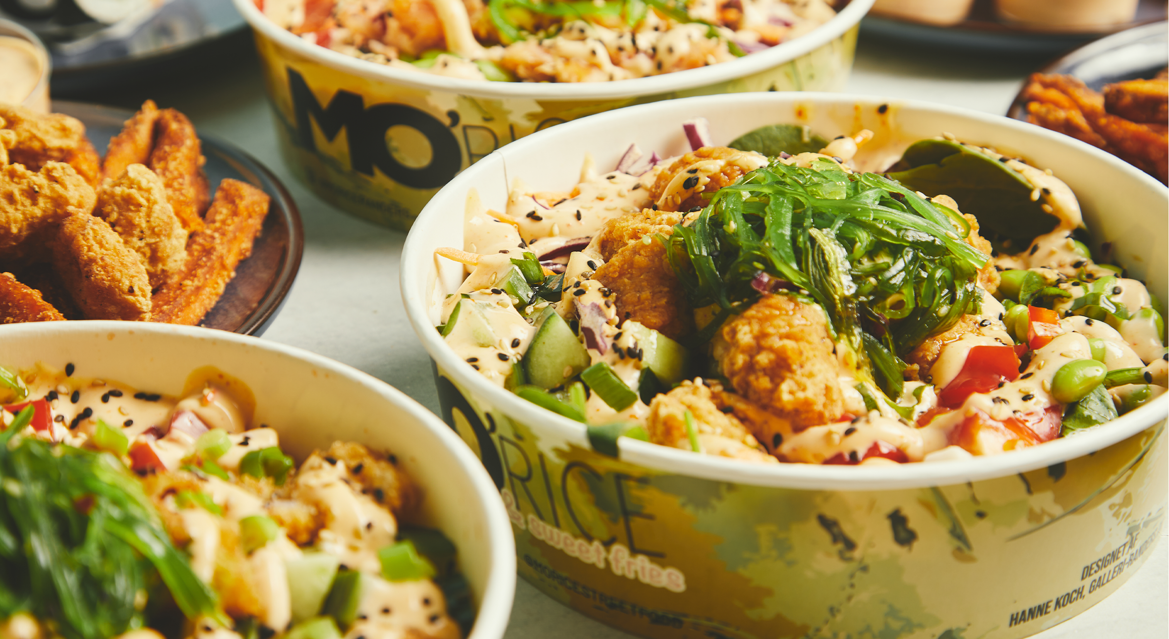 De velkomponerede poke bowls er toppet med den populære hjemmelavede MO'RICE chilimayo, hjemmelavet teriyakisauce og sesam for at binde det hele sammen. Foretrækker du en endnu sundere bowl, da fås den også uden ris, og med blomkål og babyspinat i stedet for.