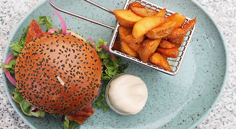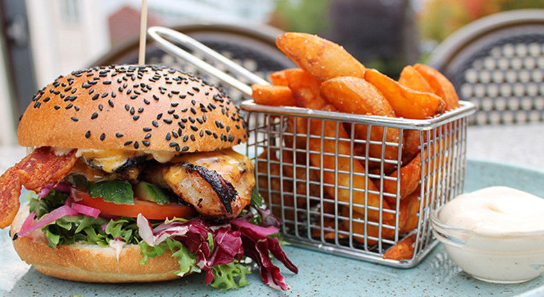 Der er 4 burgere at vælge imellem, der dækker den klassiske Café K Burger, Bearnaise Burger, og hvis du er ikke til oksekød, så er der både en Chicken Burger med kylling og en vegetarisk Grøntsagsburger. Mon ikke en af disse burgere falder i din smag.