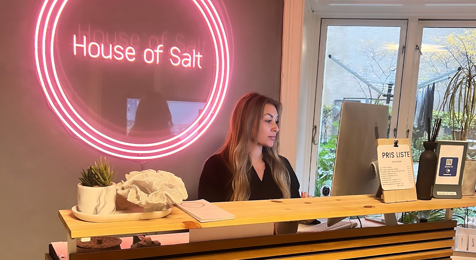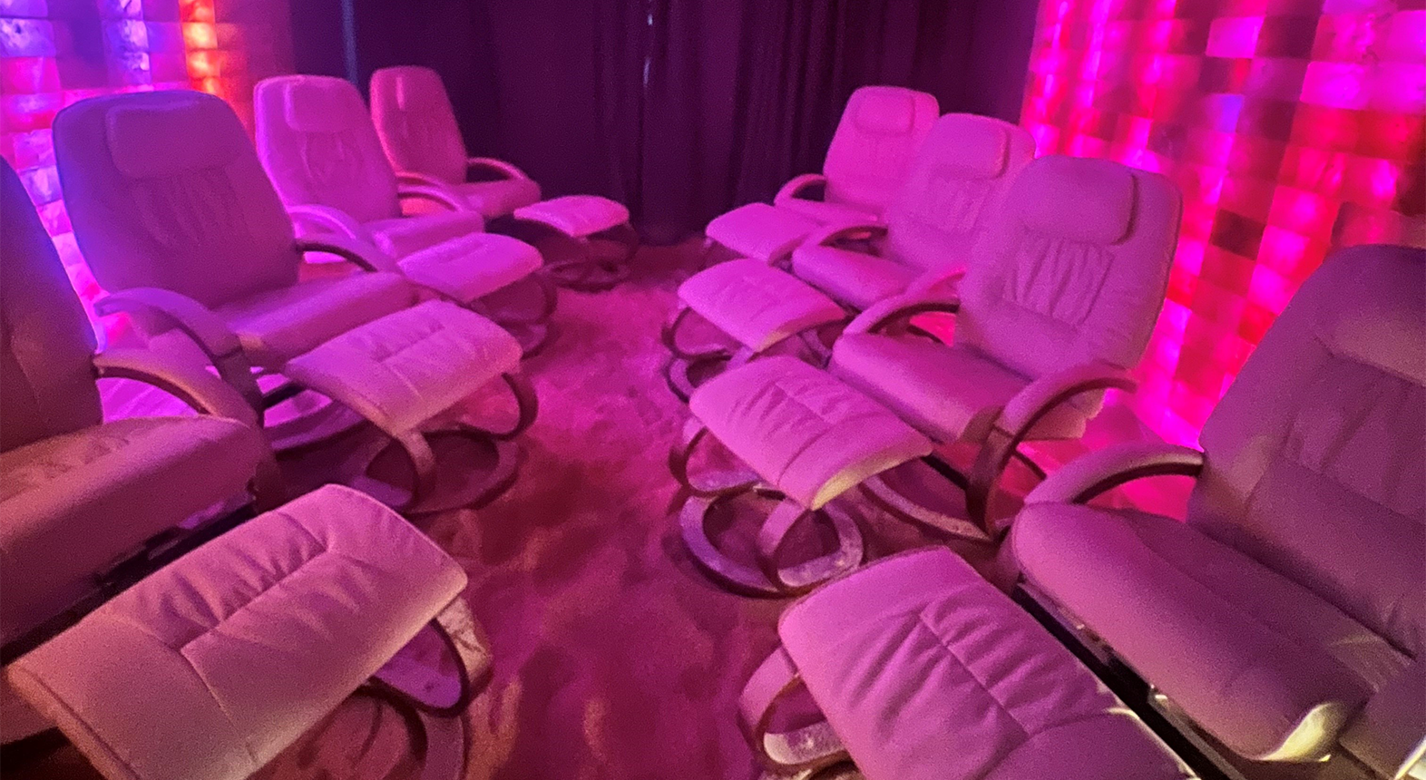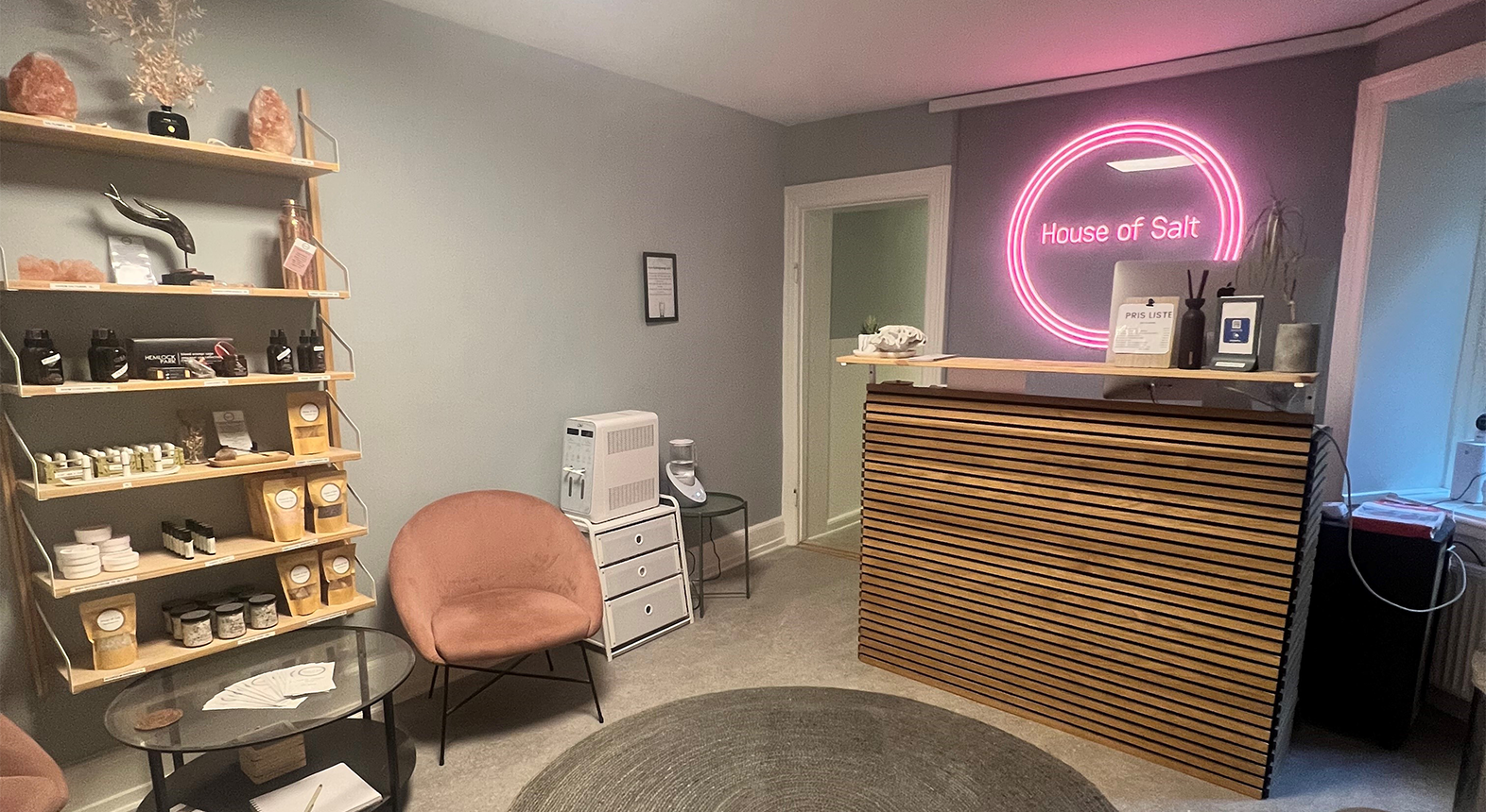 Når du træder ind til saltterapi hos House of Salt foregår det i det meget smukke og afslappende rum. Her er der spredt lyserødt salt ud som sand på hele gulvet, og væggene består af smukke saltplader. Rummet bliver fyldt med saltdampe og afslappende musik, så det eneste, du skal, er at læne dig tilbage og nyde de 45 minutter i ren velvære.